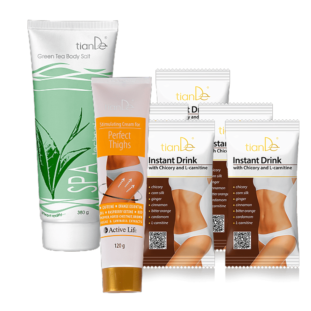 Грациозната фигура изисква цялостен подход. Тази опияняващо ароматизирана сол за тяло ще помогне за подобряване на тонуса и текстурата на кожата, затоплящият крем за стимулиране на бедрата ще се насочи ефективно към проблемните зони, а разтворимата напитка с цикория и L-карнитин* ще засили метаболизма ви, ще ограничи апетита ви и ще намали желанието за сладко. Възползвайте се от страхотна оферта за този комплект за отслабване! За невероятни резултати не забравяйте за упражненията.