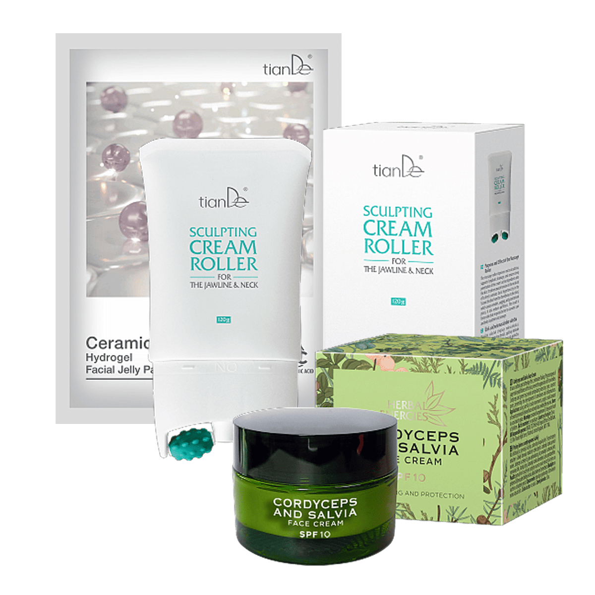 Купете крема за лице Крем с ролер за моделиране на линията на брадичката и шията + хидрогелните желеобразни пластири за лице с керамиди – и получавате безплатен крем за лице с кордицепс и градински чай!